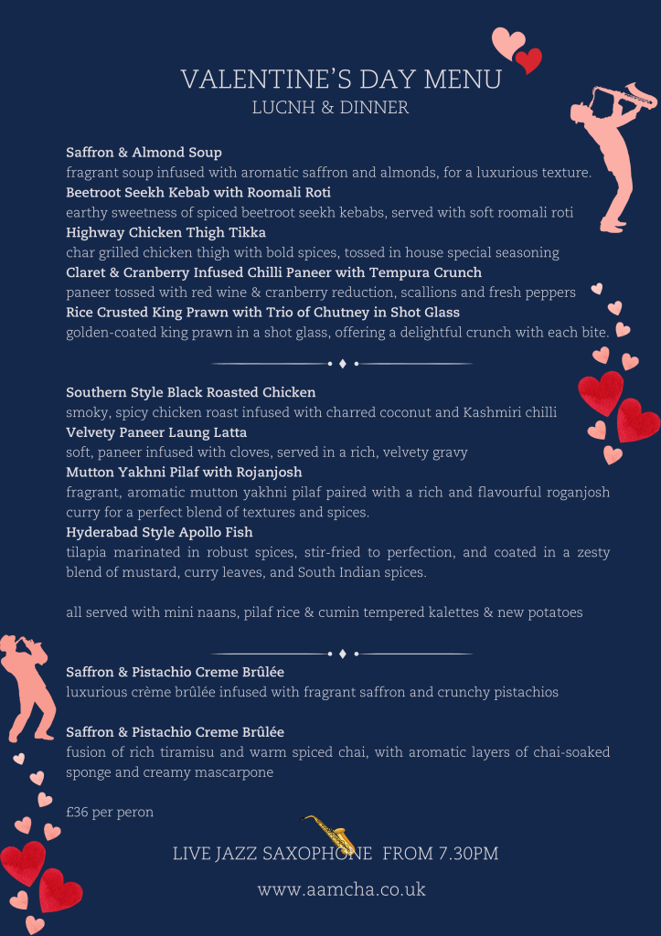 This Valentine’s Day, make it a celebration to remember at Aamcha! Treat your loved one to a magical evening filled with romance, live jazz, and a candlelit dinner that sets the perfect mood. Our specially curated menu is crafted to make the night truly special, offering a blend of flavours that pair beautifully with the intimate ambiance. Whether you’re creating new memories or cherishing years of love, this is your chance to celebrate in style. Don’t miss out – book your table now and let the magic of love unfold! ❤️